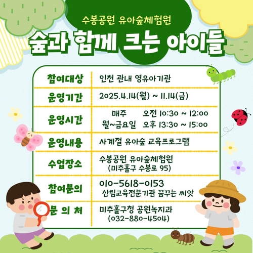 체험 신청에 대한 자세한 사항은 미추홀구 누리집 내 공원숲학교에서 확인하거나 구청 공원녹지과(032-880-4504)로 문의하면 된다.