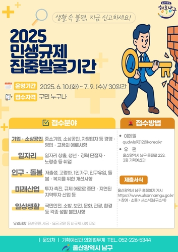 울산 남구(구청장 서동욱)는 주민 생활에 불편을 주는 불합리한 규제와 제도, 절차를 적극 발굴하기 위해 '2025 민생규제 집중발굴 기간'을 6월 10일부터 7월 9일까지 30일간 운영한다고 밝혔다.